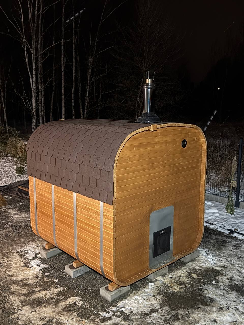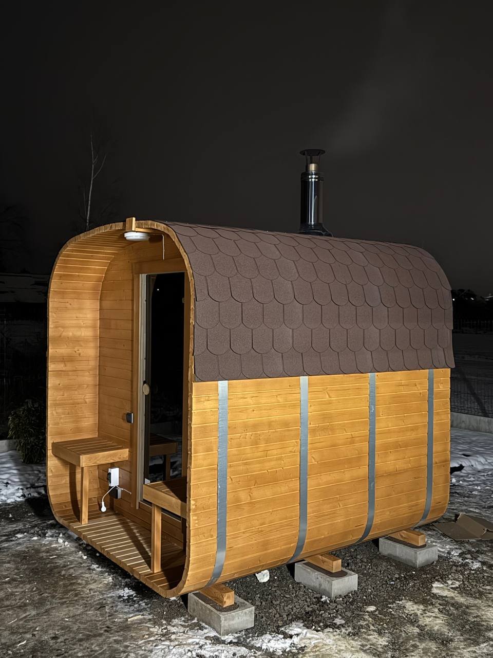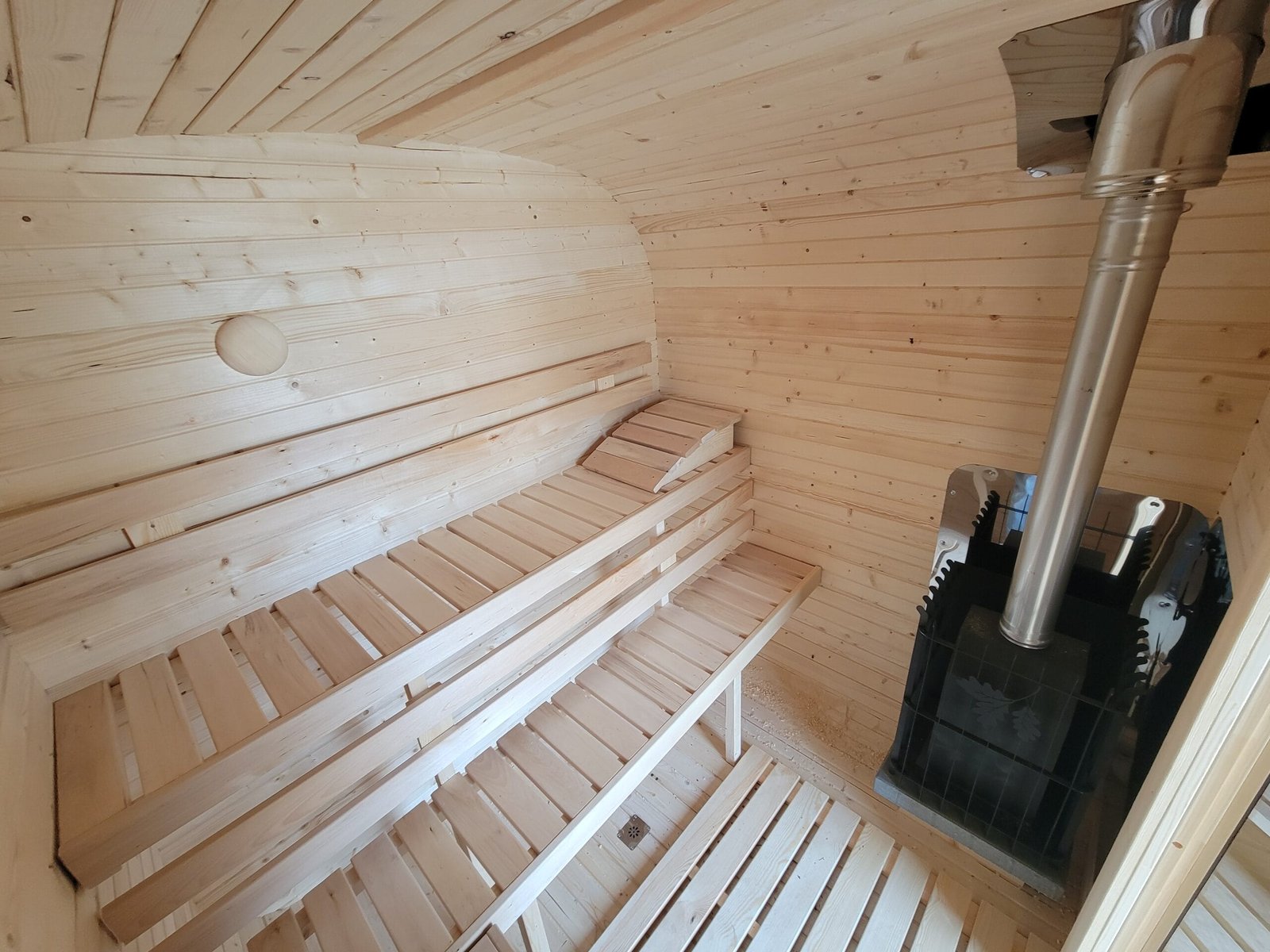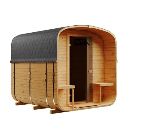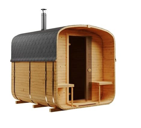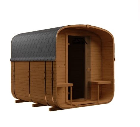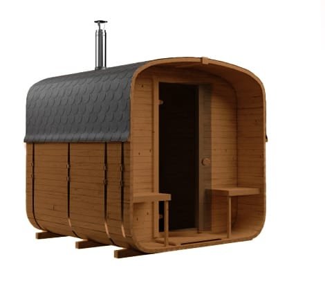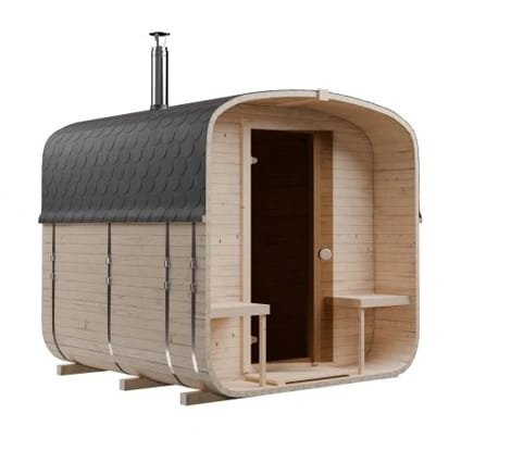 Kompaktowa sauna ogrodowa BECZKA 240 o długości 2,35 m z tarasem 0,4 m i częścią sauny 1,75 m. Wykonana ze szwedzkiego świerku, z ławkami z olchy i drzwiami z hartowanego szkła w kolorze brązu. Lekka konstrukcja nie wymaga fundamentów i szybko się nagrzewa. Idealna propozycja do ogrodu lub na działkę.