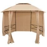 Ta altana z zasłonami o klasycznym i eleganckim wyglądzie zapewni idealne schronienie przed słońcem na imprezach plenerowych, takich jak obiady, grille, spotkania rodzinne itp. Odporne na działanie wody dach i zasłony wykonane są z tkaniny poliestrowej z powłoką poliamidową (PA). Rama jest solidnie wykonana z mocnej, malowanej proszkowo stali, co zapewnia odporność na rdzę i wysoką stabilność. Zadaszenie ma stylową konstrukcję z systemem podwójnej wentylacji, który zapewnia lepsze przewietrzanie. Łatwe w czyszczeniu, poliestrowe zasłony można zaciągnąć, aby uzyskać nieco prywatności, lub też odsunąć poprzez spięcie załączonymi opaskami. Altana będzie doskonałym wyborem dla wszelkich spotkań towarzyskich. Montaż jest bardzo łatwy. UWAGA: tego produktu NIE WOLNO używać podczas złej pogody, takiej jak silny wiatr, intensywne opady deszczu lub śniegu, burza itp.